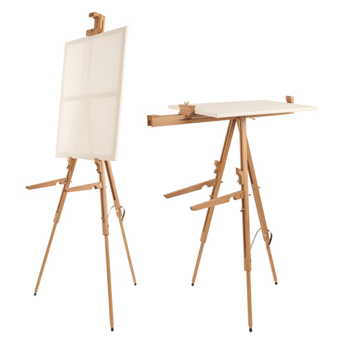 It folds into a compact unit weighing only 9 lbs and features a leather carrying handle for easy transport. A single heavy-duty wing nut adjusts the angle from vertical to horizontal, making it suitable for watercolour, oil or acrylic.