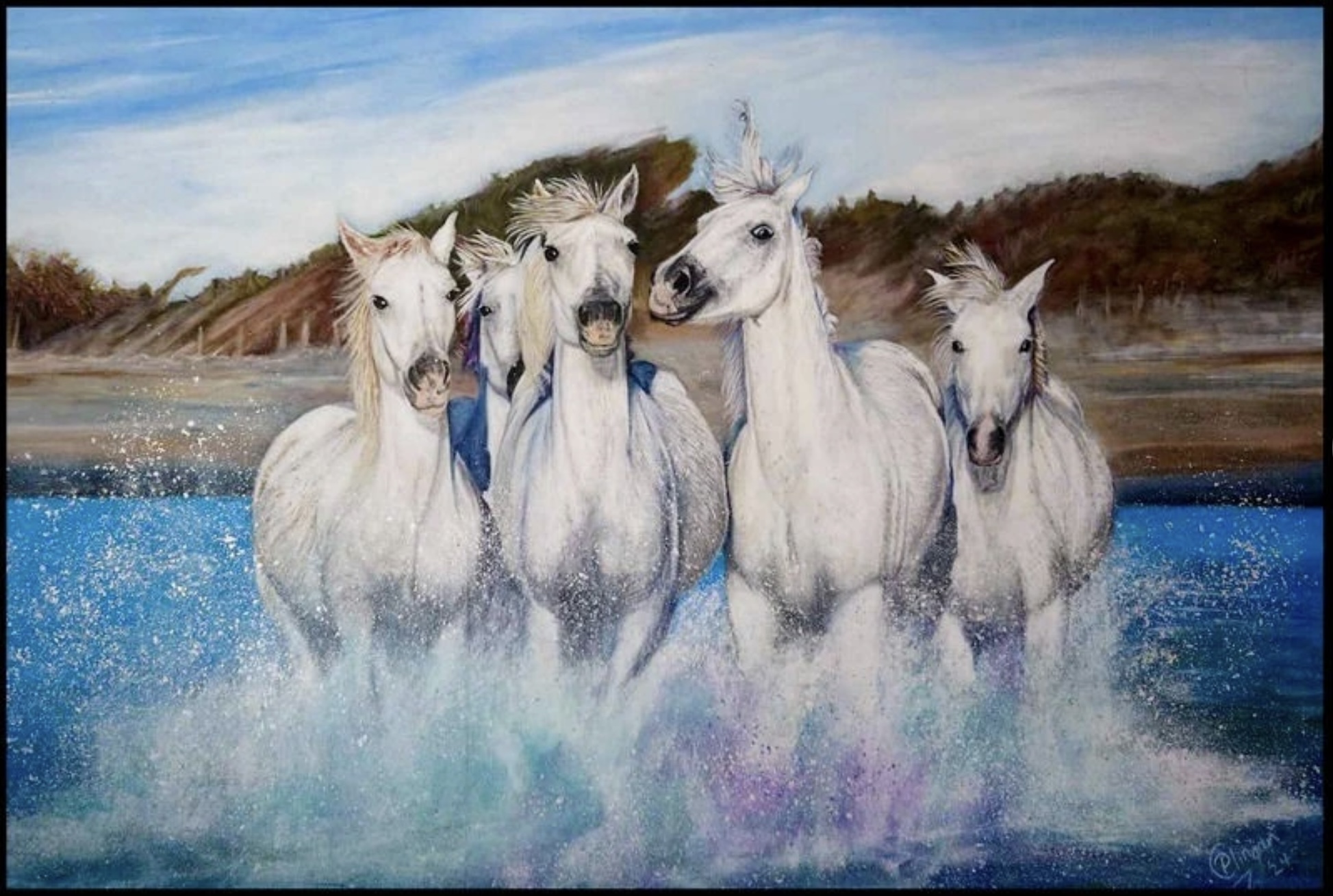 A group of Camargue Ponies dashing through the sea to pastures new.