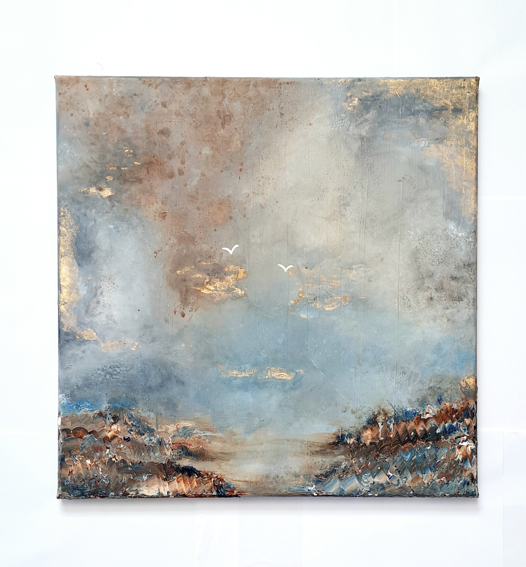 Blue, brown and grey hues used to create a more subtle base which is highlighted by gold foil accents. Thicker paint is then added to the bases to create the land effect.